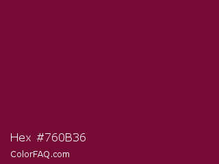 Hex #760b36 Color is a dark rose color and the nearest color is Siren #7a013a. Hex code #760b36 and RGB value is rgb(118,11,54). In RGB color space, this color is composed of 46% red, 4% green, 21% blue, In CMYK color space, this color is composed of 0% cyan, 91% magenta, 54% yellow , 54% black , In HSL color space, this color has a hue angle of 336° , 83% saturation and 25% lightness.
