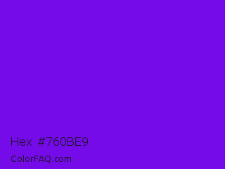 Hex #760be9 Color is a normal violet color and the nearest color is Electric Indigo #6f00ff. Hex code #760be9 and RGB value is rgb(118,11,233). In RGB color space, this color is composed of 46% red, 4% green, 91% blue, In CMYK color space, this color is composed of 49% cyan, 95% magenta, 0% yellow , 9% black , In HSL color space, this color has a hue angle of 269° , 91% saturation and 48% lightness.