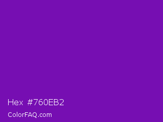 Hex #760eb2 Color is a normal purple color and the nearest color is Violet RYB #8601af. Hex code #760eb2 and RGB value is rgb(118,14,178). In RGB color space, this color is composed of 46% red, 5% green, 70% blue, In CMYK color space, this color is composed of 34% cyan, 92% magenta, 0% yellow , 30% black , In HSL color space, this color has a hue angle of 278° , 85% saturation and 38% lightness.