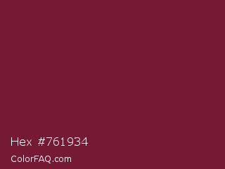 Hex #761934 Color is a dark rose color and the nearest color is Claret #7f1734. Hex code #761934 and RGB value is rgb(118,25,52). In RGB color space, this color is composed of 46% red, 10% green, 20% blue, In CMYK color space, this color is composed of 0% cyan, 79% magenta, 56% yellow , 54% black , In HSL color space, this color has a hue angle of 343° , 65% saturation and 28% lightness.