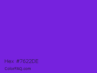 Hex #7622de Color is a normal violet color and the nearest color is Blue Violet #8a2be2. Hex code #7622de and RGB value is rgb(118,34,222). In RGB color space, this color is composed of 46% red, 13% green, 87% blue, In CMYK color space, this color is composed of 47% cyan, 85% magenta, 0% yellow , 13% black , In HSL color space, this color has a hue angle of 267° , 74% saturation and 50% lightness.