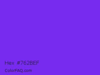 Hex #762bef Color is a normal violet color and the nearest color is Blue Violet #8a2be2. Hex code #762bef and RGB value is rgb(118,43,239). In RGB color space, this color is composed of 46% red, 17% green, 94% blue, In CMYK color space, this color is composed of 51% cyan, 82% magenta, 0% yellow , 6% black , In HSL color space, this color has a hue angle of 263° , 86% saturation and 55% lightness.