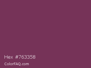 Hex #763358 Color is a normal magenta color and the nearest color is Cosmic #76395d. Hex code #763358 and RGB value is rgb(118,51,88). In RGB color space, this color is composed of 46% red, 20% green, 35% blue, In CMYK color space, this color is composed of 0% cyan, 57% magenta, 25% yellow , 54% black , In HSL color space, this color has a hue angle of 327° , 40% saturation and 33% lightness.