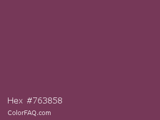 Hex #763858 Color is a normal rose color and the nearest color is Cosmic #76395d. Hex code #763858 and RGB value is rgb(118,56,88). In RGB color space, this color is composed of 46% red, 22% green, 35% blue, In CMYK color space, this color is composed of 0% cyan, 53% magenta, 25% yellow , 54% black , In HSL color space, this color has a hue angle of 329° , 36% saturation and 34% lightness.
