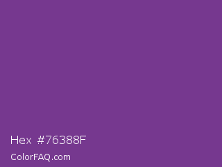 Hex #76388f Color is a normal purple color and the nearest color is Vivid Violet #803790. Hex code #76388f and RGB value is rgb(118,56,143). In RGB color space, this color is composed of 46% red, 22% green, 56% blue, In CMYK color space, this color is composed of 17% cyan, 61% magenta, 0% yellow , 44% black , In HSL color space, this color has a hue angle of 283° , 44% saturation and 39% lightness.