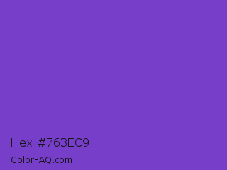 Hex #763ec9 Color is a normal violet color and the nearest color is Purple Heart Crayola #652dc1. Hex code #763ec9 and RGB value is rgb(118,62,201). In RGB color space, this color is composed of 46% red, 24% green, 79% blue, In CMYK color space, this color is composed of 41% cyan, 69% magenta, 0% yellow , 21% black , In HSL color space, this color has a hue angle of 264° , 56% saturation and 52% lightness.