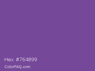 Hex #764899 Color is a normal purple color and the nearest color is Affair #714693. Hex code #764899 and RGB value is rgb(118,72,153). In RGB color space, this color is composed of 46% red, 28% green, 60% blue, In CMYK color space, this color is composed of 23% cyan, 53% magenta, 0% yellow , 40% black , In HSL color space, this color has a hue angle of 274° , 36% saturation and 44% lightness.