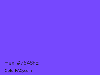 Hex #7648fe Color is a light indigo color and the nearest color is Very Light Blue #6666ff. Hex code #7648fe and RGB value is rgb(118,72,254). In RGB color space, this color is composed of 46% red, 28% green, 100% blue, In CMYK color space, this color is composed of 54% cyan, 72% magenta, 0% yellow , 0% black , In HSL color space, this color has a hue angle of 255° , 99% saturation and 64% lightness.