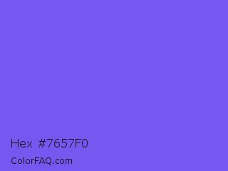 Hex #7657f0 Color is a light indigo color and the nearest color is Medium Slate Blue #7b68ee. Hex code #7657f0 and RGB value is rgb(118,87,240). In RGB color space, this color is composed of 46% red, 34% green, 94% blue, In CMYK color space, this color is composed of 51% cyan, 64% magenta, 0% yellow , 6% black , In HSL color space, this color has a hue angle of 252° , 84% saturation and 64% lightness.