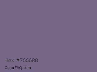 Hex #766688 Color is a normal violet color and the nearest color is Rum #796989. Hex code #766688 and RGB value is rgb(118,102,136). In RGB color space, this color is composed of 46% red, 40% green, 53% blue, In CMYK color space, this color is composed of 13% cyan, 25% magenta, 0% yellow , 47% black , In HSL color space, this color has a hue angle of 268° , 14% saturation and 47% lightness.