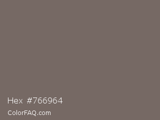 Hex #766964 Color is a normal orange color and the nearest color is Sandstone #796d62. Hex code #766964 and RGB value is rgb(118,105,100). In RGB color space, this color is composed of 46% red, 41% green, 39% blue, In CMYK color space, this color is composed of 0% cyan, 11% magenta, 15% yellow , 54% black , In HSL color space, this color has a hue angle of 17° , 8% saturation and 43% lightness.