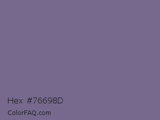 Hex #76698d Color is a normal violet color and the nearest color is Rum #796989. Hex code #76698d and RGB value is rgb(118,105,141). In RGB color space, this color is composed of 46% red, 41% green, 55% blue, In CMYK color space, this color is composed of 16% cyan, 26% magenta, 0% yellow , 45% black , In HSL color space, this color has a hue angle of 262° , 15% saturation and 48% lightness.