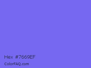 Hex #7669ef Color is a light indigo color and the nearest color is Medium Slate Blue #7b68ee. Hex code #7669ef and RGB value is rgb(118,105,239). In RGB color space, this color is composed of 46% red, 41% green, 94% blue, In CMYK color space, this color is composed of 51% cyan, 56% magenta, 0% yellow , 6% black , In HSL color space, this color has a hue angle of 246° , 81% saturation and 67% lightness.