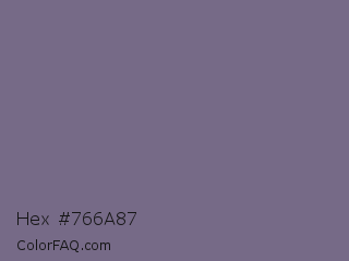 Hex #766a87 Color is a normal violet color and the nearest color is Rum #796989. Hex code #766a87 and RGB value is rgb(118,106,135). In RGB color space, this color is composed of 46% red, 42% green, 53% blue, In CMYK color space, this color is composed of 13% cyan, 21% magenta, 0% yellow , 47% black , In HSL color space, this color has a hue angle of 265° , 12% saturation and 47% lightness.