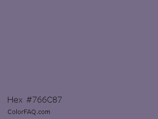 Hex #766c87 Color is a normal violet color and the nearest color is Rum #796989. Hex code #766c87 and RGB value is rgb(118,108,135). In RGB color space, this color is composed of 46% red, 42% green, 53% blue, In CMYK color space, this color is composed of 13% cyan, 20% magenta, 0% yellow , 47% black , In HSL color space, this color has a hue angle of 262° , 11% saturation and 48% lightness.
