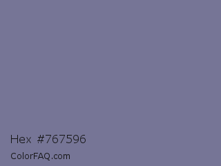 Hex #767596 Color is a normal indigo color and the nearest color is Rhythm #777696. Hex code #767596 and RGB value is rgb(118,117,150). In RGB color space, this color is composed of 46% red, 46% green, 59% blue, In CMYK color space, this color is composed of 21% cyan, 22% magenta, 0% yellow , 41% black , In HSL color space, this color has a hue angle of 242° , 14% saturation and 52% lightness.