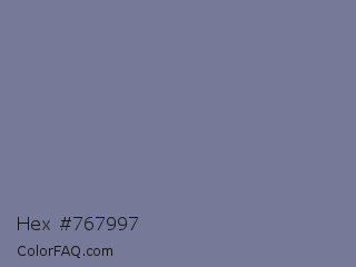 Hex #767997 Color is a normal blue color and the nearest color is Rhythm #777696. Hex code #767997 and RGB value is rgb(118,121,151). In RGB color space, this color is composed of 46% red, 47% green, 59% blue, In CMYK color space, this color is composed of 22% cyan, 20% magenta, 0% yellow , 41% black , In HSL color space, this color has a hue angle of 235° , 14% saturation and 53% lightness.