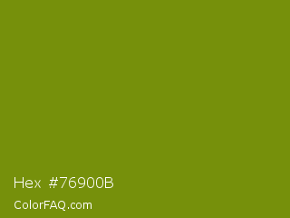 Hex #76900b Color is a dark lime color and the nearest color is Limeade #6f9d02. Hex code #76900b and RGB value is rgb(118,144,11). In RGB color space, this color is composed of 46% red, 56% green, 4% blue, In CMYK color space, this color is composed of 18% cyan, 0% magenta, 92% yellow , 44% black , In HSL color space, this color has a hue angle of 72° , 86% saturation and 30% lightness.