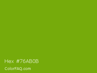 Hex #76ab0b Color is a normal green color and the nearest color is Christi #67a712. Hex code #76ab0b and RGB value is rgb(118,171,11). In RGB color space, this color is composed of 46% red, 67% green, 4% blue, In CMYK color space, this color is composed of 31% cyan, 0% magenta, 94% yellow , 33% black , In HSL color space, this color has a hue angle of 80° , 88% saturation and 36% lightness.