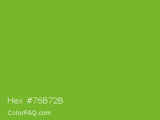 Hex #76b72b Color is a normal green color and the nearest color is Green RYB #66b032. Hex code #76b72b and RGB value is rgb(118,183,43). In RGB color space, this color is composed of 46% red, 72% green, 17% blue, In CMYK color space, this color is composed of 36% cyan, 0% magenta, 77% yellow , 28% black , In HSL color space, this color has a hue angle of 88° , 62% saturation and 44% lightness.