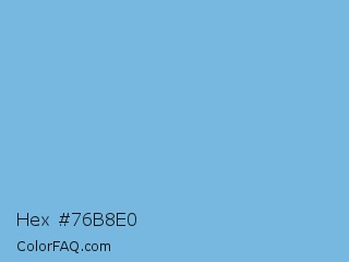 Hex #76b8e0 Color is a light blue color and the nearest color is Aero #7cb9e8. Hex code #76b8e0 and RGB value is rgb(118,184,224). In RGB color space, this color is composed of 46% red, 72% green, 88% blue, In CMYK color space, this color is composed of 47% cyan, 18% magenta, 0% yellow , 12% black , In HSL color space, this color has a hue angle of 203° , 63% saturation and 67% lightness.