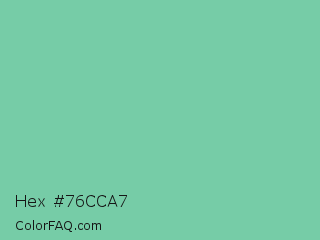 Hex #76cca7 Color is a light green color and the nearest color is Medium Aquamarine #66ddaa. Hex code #76cca7 and RGB value is rgb(118,204,167). In RGB color space, this color is composed of 46% red, 80% green, 65% blue, In CMYK color space, this color is composed of 42% cyan, 0% magenta, 18% yellow , 20% black , In HSL color space, this color has a hue angle of 154° , 46% saturation and 63% lightness.