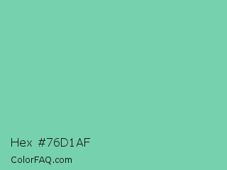 Hex #76d1af Color is a light green color and the nearest color is Medium Aquamarine #66ddaa. Hex code #76d1af and RGB value is rgb(118,209,175). In RGB color space, this color is composed of 46% red, 82% green, 69% blue, In CMYK color space, this color is composed of 44% cyan, 0% magenta, 16% yellow , 18% black , In HSL color space, this color has a hue angle of 158° , 50% saturation and 64% lightness.
