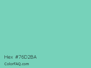 Hex #76d2ba Color is a light cyan color and the nearest color is Downy #6fd0c5. Hex code #76d2ba and RGB value is rgb(118,210,186). In RGB color space, this color is composed of 46% red, 82% green, 73% blue, In CMYK color space, this color is composed of 44% cyan, 0% magenta, 11% yellow , 18% black , In HSL color space, this color has a hue angle of 164° , 51% saturation and 64% lightness.