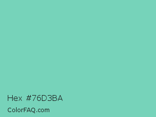 Hex #76d3ba Color is a light cyan color and the nearest color is Downy #6fd0c5. Hex code #76d3ba and RGB value is rgb(118,211,186). In RGB color space, this color is composed of 46% red, 83% green, 73% blue, In CMYK color space, this color is composed of 44% cyan, 0% magenta, 12% yellow , 17% black , In HSL color space, this color has a hue angle of 164° , 51% saturation and 65% lightness.