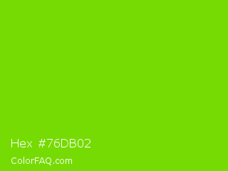 Hex #76db02 Color is a normal green color and the nearest color is Alien Armpit #84de02. Hex code #76db02 and RGB value is rgb(118,219,2). In RGB color space, this color is composed of 46% red, 86% green, 1% blue, In CMYK color space, this color is composed of 46% cyan, 0% magenta, 99% yellow , 14% black , In HSL color space, this color has a hue angle of 88° , 98% saturation and 43% lightness.