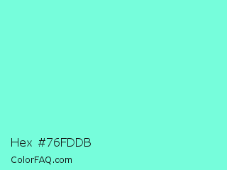Hex #76fddb Color is a light cyan color and the nearest color is Aquamarine #7fffd4. Hex code #76fddb and RGB value is rgb(118,253,219). In RGB color space, this color is composed of 46% red, 99% green, 86% blue, In CMYK color space, this color is composed of 53% cyan, 0% magenta, 13% yellow , 1% black , In HSL color space, this color has a hue angle of 165° , 97% saturation and 73% lightness.