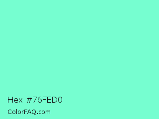 Hex #76fed0 Color is a light green color and the nearest color is Aquamarine #7fffd4. Hex code #76fed0 and RGB value is rgb(118,254,208). In RGB color space, this color is composed of 46% red, 100% green, 82% blue, In CMYK color space, this color is composed of 54% cyan, 0% magenta, 18% yellow , 0% black , In HSL color space, this color has a hue angle of 160° , 99% saturation and 73% lightness.