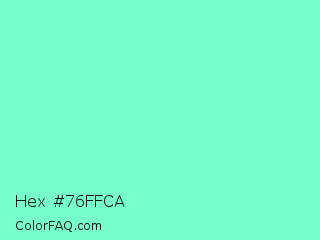 Hex #76ffca Color is a light green color and the nearest color is Aquamarine #7fffd4. Hex code #76ffca and RGB value is rgb(118,255,202). In RGB color space, this color is composed of 46% red, 100% green, 79% blue, In CMYK color space, this color is composed of 54% cyan, 0% magenta, 21% yellow , 0% black , In HSL color space, this color has a hue angle of 157° , 100% saturation and 73% lightness.
