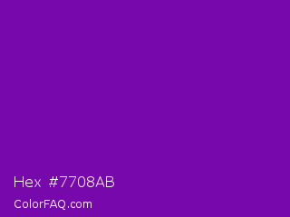 Hex #7708ab Color is a normal purple color and the nearest color is Violet RYB #8601af. Hex code #7708ab and RGB value is rgb(119,8,171). In RGB color space, this color is composed of 47% red, 3% green, 67% blue, In CMYK color space, this color is composed of 30% cyan, 95% magenta, 0% yellow , 33% black , In HSL color space, this color has a hue angle of 281° , 91% saturation and 35% lightness.