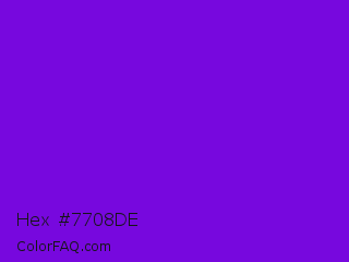 Hex #7708de Color is a normal purple color and the nearest color is French Violet #8806ce. Hex code #7708de and RGB value is rgb(119,8,222). In RGB color space, this color is composed of 47% red, 3% green, 87% blue, In CMYK color space, this color is composed of 46% cyan, 96% magenta, 0% yellow , 13% black , In HSL color space, this color has a hue angle of 271° , 93% saturation and 45% lightness.
