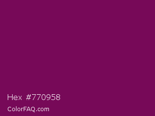 Hex #770958 Color is a dark magenta color and the nearest color is French Plum #811453. Hex code #770958 and RGB value is rgb(119,9,88). In RGB color space, this color is composed of 47% red, 4% green, 35% blue, In CMYK color space, this color is composed of 0% cyan, 92% magenta, 26% yellow , 53% black , In HSL color space, this color has a hue angle of 317° , 86% saturation and 25% lightness.