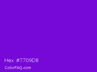 Hex #7709d8 Color is a normal purple color and the nearest color is French Violet #8806ce. Hex code #7709d8 and RGB value is rgb(119,9,216). In RGB color space, this color is composed of 47% red, 4% green, 85% blue, In CMYK color space, this color is composed of 45% cyan, 96% magenta, 0% yellow , 15% black , In HSL color space, this color has a hue angle of 272° , 92% saturation and 44% lightness.