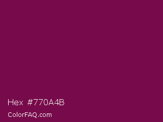 Hex #770a4b Color is a dark magenta color and the nearest color is Rose Bud Cherry #800b47. Hex code #770a4b and RGB value is rgb(119,10,75). In RGB color space, this color is composed of 47% red, 4% green, 29% blue, In CMYK color space, this color is composed of 0% cyan, 92% magenta, 37% yellow , 53% black , In HSL color space, this color has a hue angle of 324° , 84% saturation and 25% lightness.