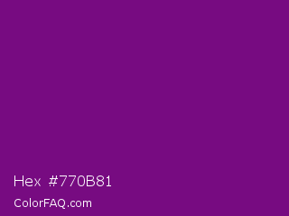 Hex #770b81 Color is a dark magenta color and the nearest color is Patriarch #800080. Hex code #770b81 and RGB value is rgb(119,11,129). In RGB color space, this color is composed of 47% red, 4% green, 51% blue, In CMYK color space, this color is composed of 8% cyan, 91% magenta, 0% yellow , 49% black , In HSL color space, this color has a hue angle of 295° , 84% saturation and 27% lightness.