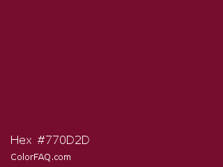 Hex #770d2d Color is a dark rose color and the nearest color is Claret #7f1734. Hex code #770d2d and RGB value is rgb(119,13,45). In RGB color space, this color is composed of 47% red, 5% green, 18% blue, In CMYK color space, this color is composed of 0% cyan, 89% magenta, 62% yellow , 53% black , In HSL color space, this color has a hue angle of 342° , 80% saturation and 26% lightness.