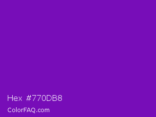 Hex #770db8 Color is a normal purple color and the nearest color is Violet RYB #8601af. Hex code #770db8 and RGB value is rgb(119,13,184). In RGB color space, this color is composed of 47% red, 5% green, 72% blue, In CMYK color space, this color is composed of 35% cyan, 93% magenta, 0% yellow , 28% black , In HSL color space, this color has a hue angle of 277° , 87% saturation and 39% lightness.