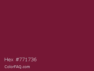 Hex #771736 Color is a dark rose color and the nearest color is Claret #7f1734. Hex code #771736 and RGB value is rgb(119,23,54). In RGB color space, this color is composed of 47% red, 9% green, 21% blue, In CMYK color space, this color is composed of 0% cyan, 81% magenta, 55% yellow , 53% black , In HSL color space, this color has a hue angle of 341° , 68% saturation and 28% lightness.