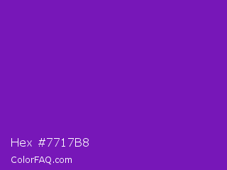 Hex #7717b8 Color is a normal purple color and the nearest color is Violet RYB #8601af. Hex code #7717b8 and RGB value is rgb(119,23,184). In RGB color space, this color is composed of 47% red, 9% green, 72% blue, In CMYK color space, this color is composed of 35% cyan, 88% magenta, 0% yellow , 28% black , In HSL color space, this color has a hue angle of 276° , 78% saturation and 41% lightness.