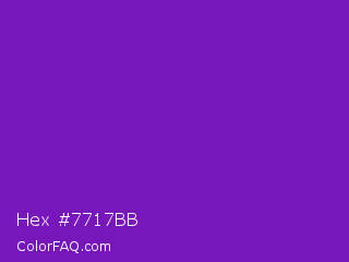 Hex #7717bb Color is a normal purple color and the nearest color is Purple Heart Crayola #652dc1. Hex code #7717bb and RGB value is rgb(119,23,187). In RGB color space, this color is composed of 47% red, 9% green, 73% blue, In CMYK color space, this color is composed of 36% cyan, 88% magenta, 0% yellow , 27% black , In HSL color space, this color has a hue angle of 275° , 78% saturation and 41% lightness.