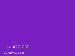 Hex #771fbe Color is a normal purple color and the nearest color is Purple Heart Crayola #652dc1. Hex code #771fbe and RGB value is rgb(119,31,190). In RGB color space, this color is composed of 47% red, 12% green, 75% blue, In CMYK color space, this color is composed of 37% cyan, 84% magenta, 0% yellow , 25% black , In HSL color space, this color has a hue angle of 273° , 72% saturation and 43% lightness.
