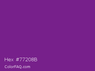 Hex #77208b Color is a normal purple color and the nearest color is Seance #731e8f. Hex code #77208b and RGB value is rgb(119,32,139). In RGB color space, this color is composed of 47% red, 13% green, 55% blue, In CMYK color space, this color is composed of 14% cyan, 77% magenta, 0% yellow , 45% black , In HSL color space, this color has a hue angle of 289° , 63% saturation and 34% lightness.