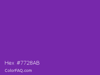 Hex #7728ab Color is a normal purple color and the nearest color is Grape #6f2da8. Hex code #7728ab and RGB value is rgb(119,40,171). In RGB color space, this color is composed of 47% red, 16% green, 67% blue, In CMYK color space, this color is composed of 30% cyan, 77% magenta, 0% yellow , 33% black , In HSL color space, this color has a hue angle of 276° , 62% saturation and 41% lightness.