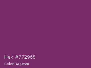 Hex #772968 Color is a normal magenta color and the nearest color is Byzantium #702963. Hex code #772968 and RGB value is rgb(119,41,104). In RGB color space, this color is composed of 47% red, 16% green, 41% blue, In CMYK color space, this color is composed of 0% cyan, 66% magenta, 13% yellow , 53% black , In HSL color space, this color has a hue angle of 312° , 49% saturation and 31% lightness.