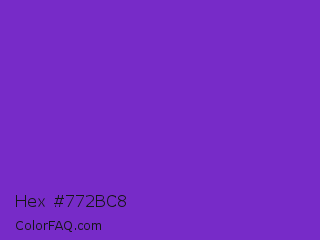 Hex #772bc8 Color is a normal violet color and the nearest color is Purple Heart Crayola #652dc1. Hex code #772bc8 and RGB value is rgb(119,43,200). In RGB color space, this color is composed of 47% red, 17% green, 78% blue, In CMYK color space, this color is composed of 41% cyan, 79% magenta, 0% yellow , 22% black , In HSL color space, this color has a hue angle of 269° , 65% saturation and 48% lightness.