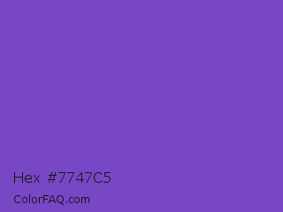 Hex #7747c5 Color is a normal violet color and the nearest color is Fuchsia Blue #7a58c1. Hex code #7747c5 and RGB value is rgb(119,71,197). In RGB color space, this color is composed of 47% red, 28% green, 77% blue, In CMYK color space, this color is composed of 40% cyan, 64% magenta, 0% yellow , 23% black , In HSL color space, this color has a hue angle of 263° , 52% saturation and 53% lightness.